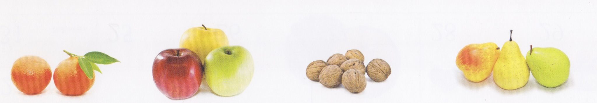 Arance, cachi, castagne, cedri, limoni, mandarini, mele, melagrane, noci, pere, rabarbaro, uva.