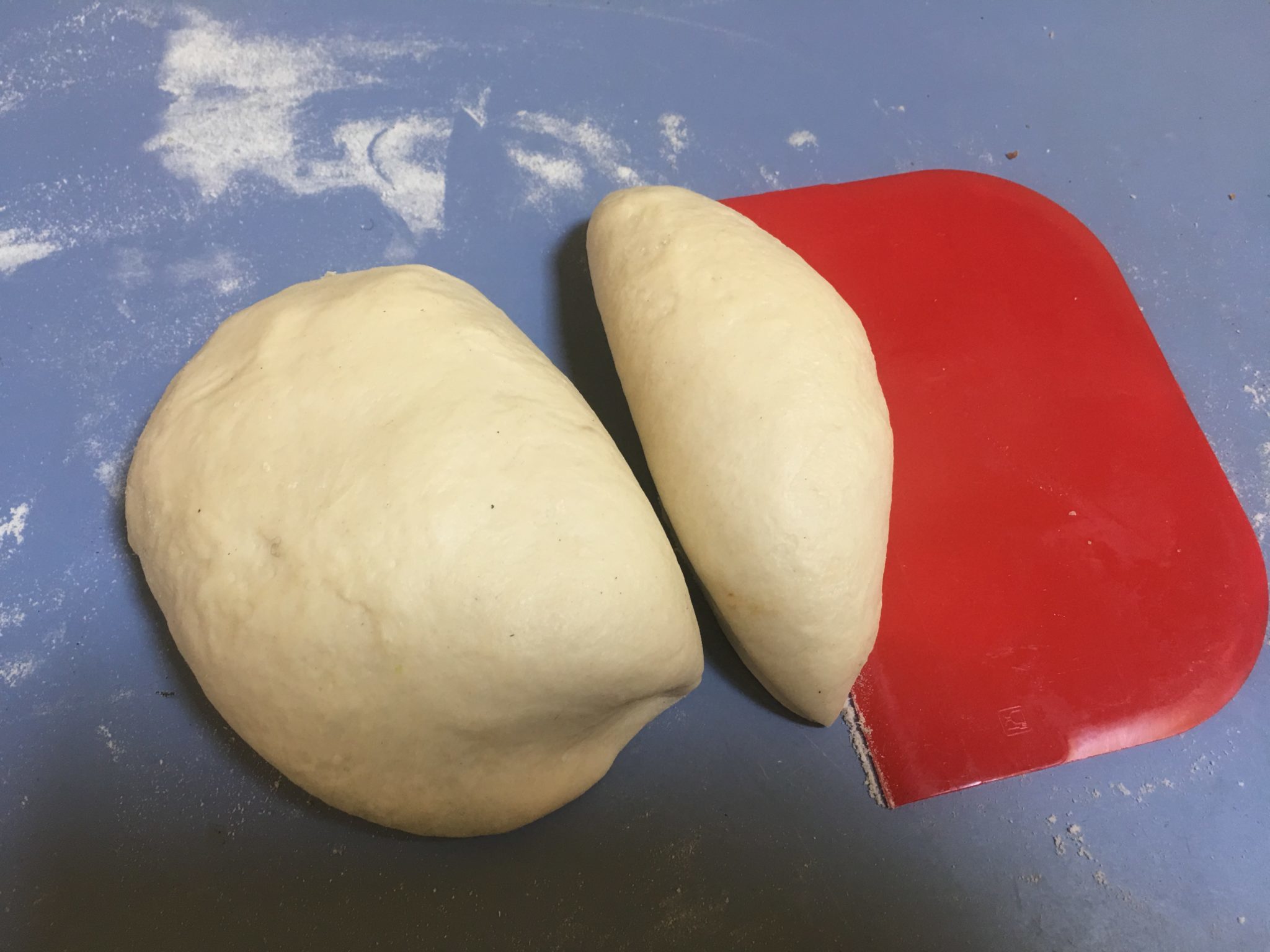Togliamo la pasta dalla pellicola e la dividiamo idealmente in tre parti: levandone un terzo che ci servirà per il coperchio della pizza.