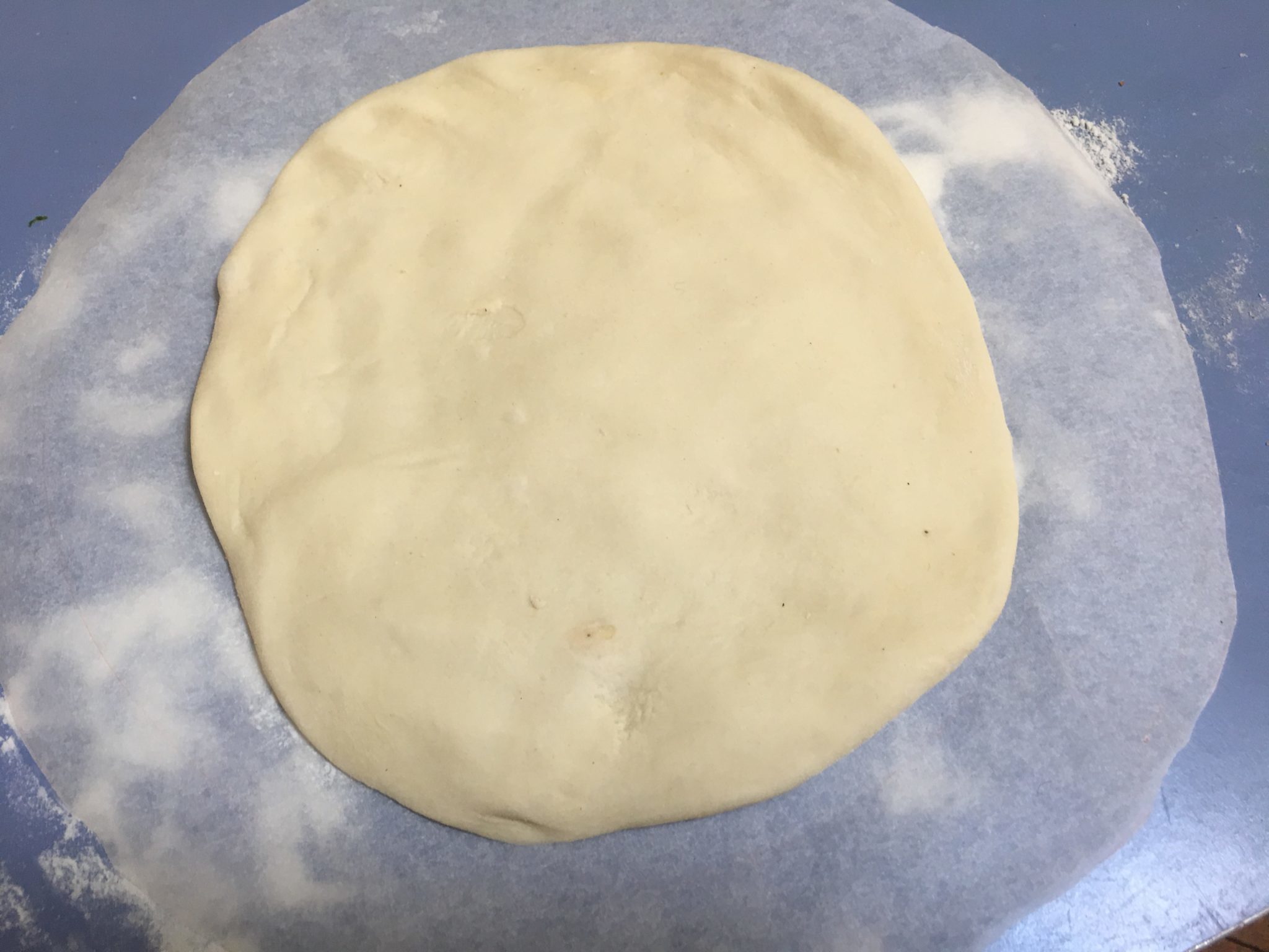 Tagliamo un cerchio di carta forno di circa 32 cm e ci stendiamo sopra la pasta.