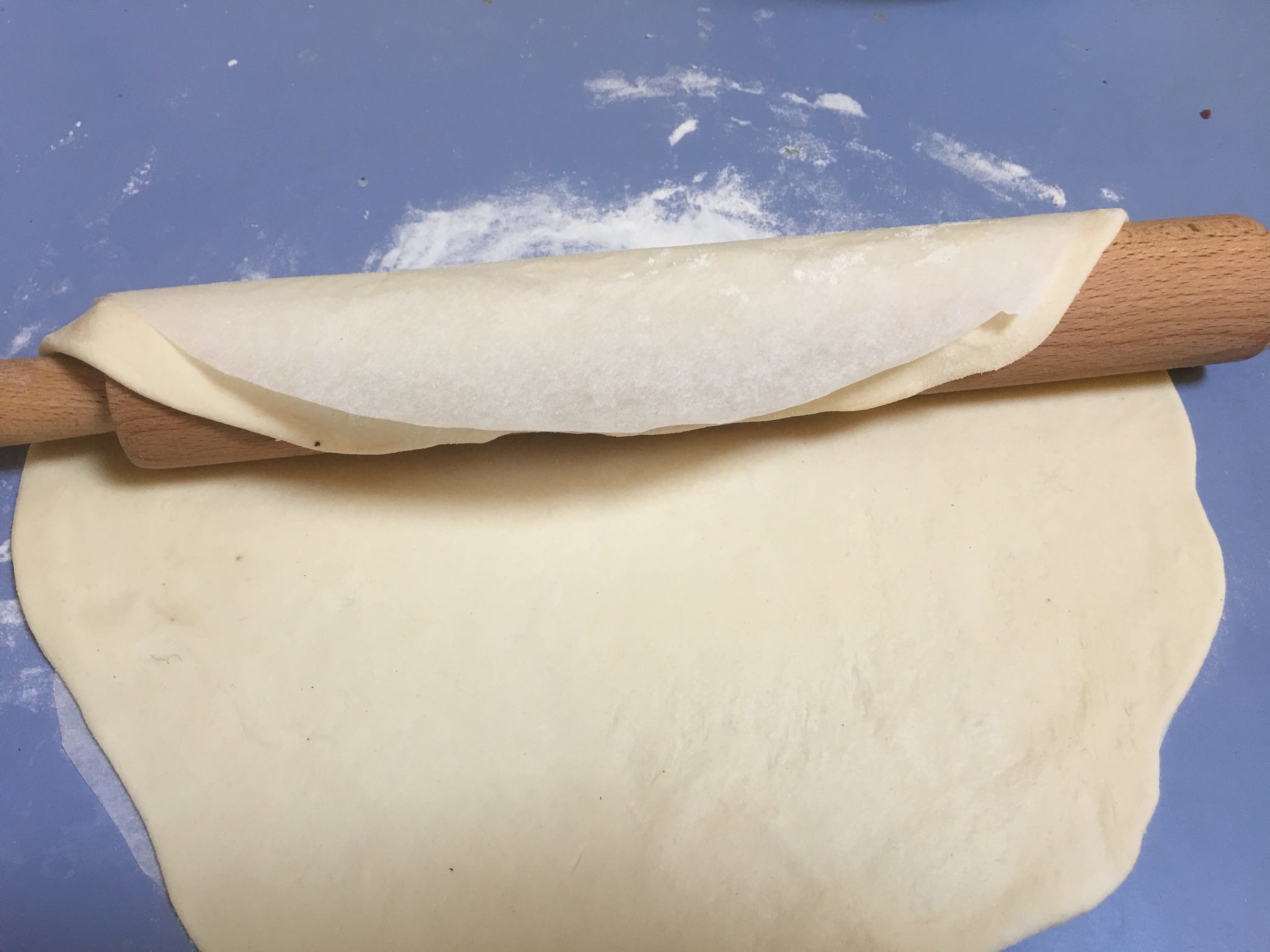 La allarghiamo prima con la punta delle dita, poi aiutandoci col mattarello fino a raggiungere lo stesso diametro della carta.