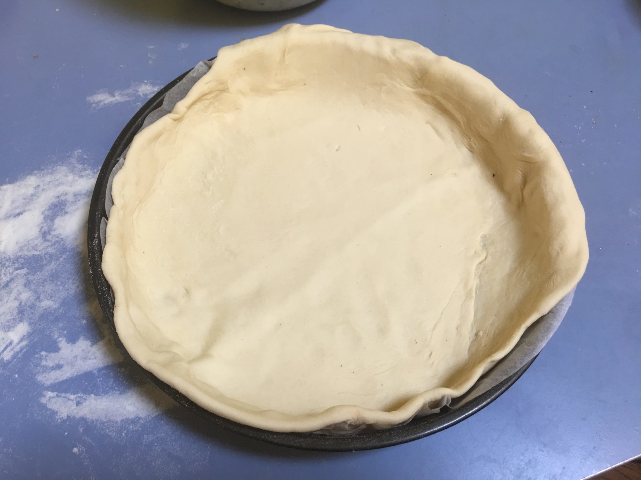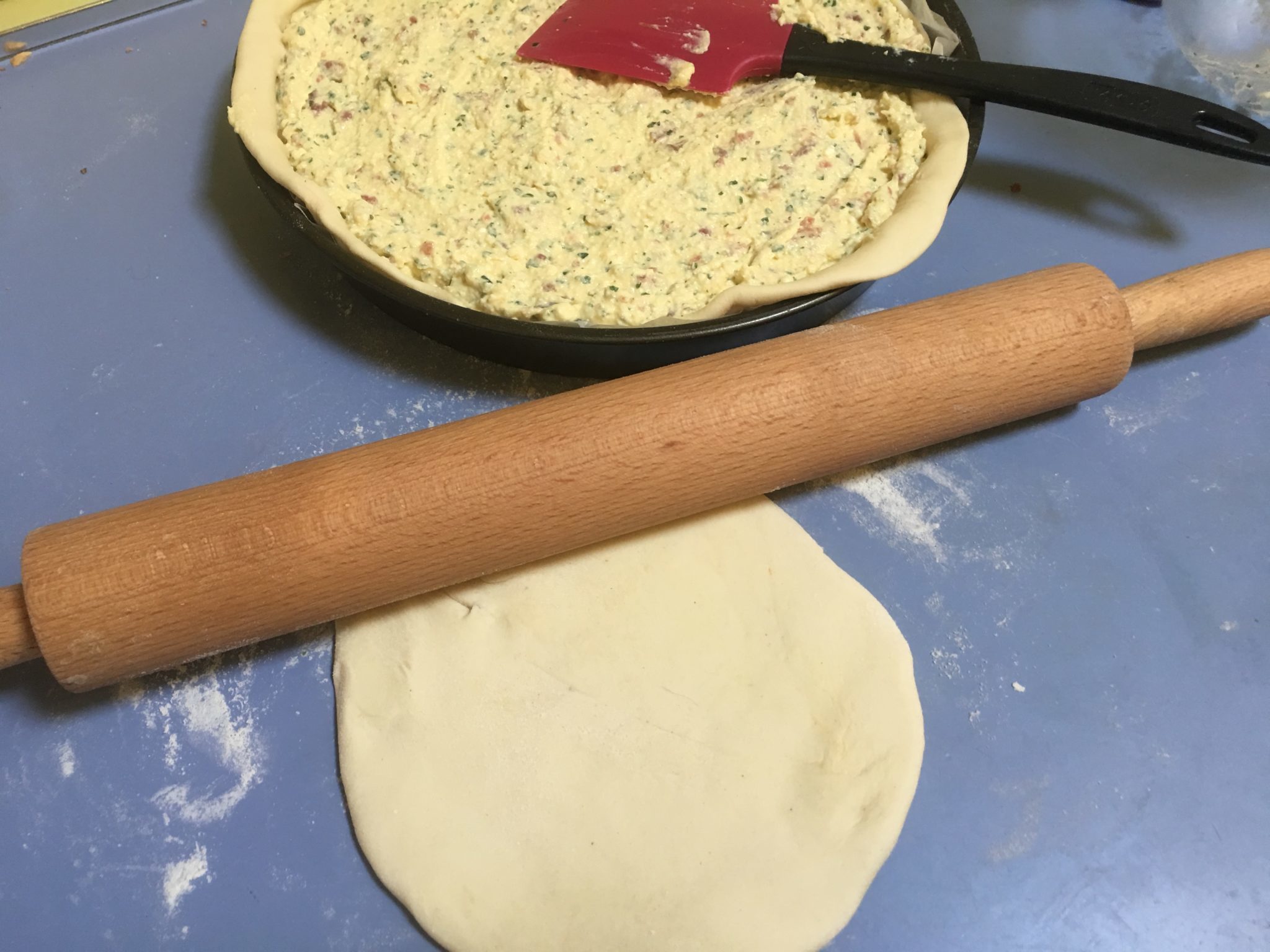 Arrotoliamo l’impasto intorno al mattarello e lo portiamo sopra la tortiera.