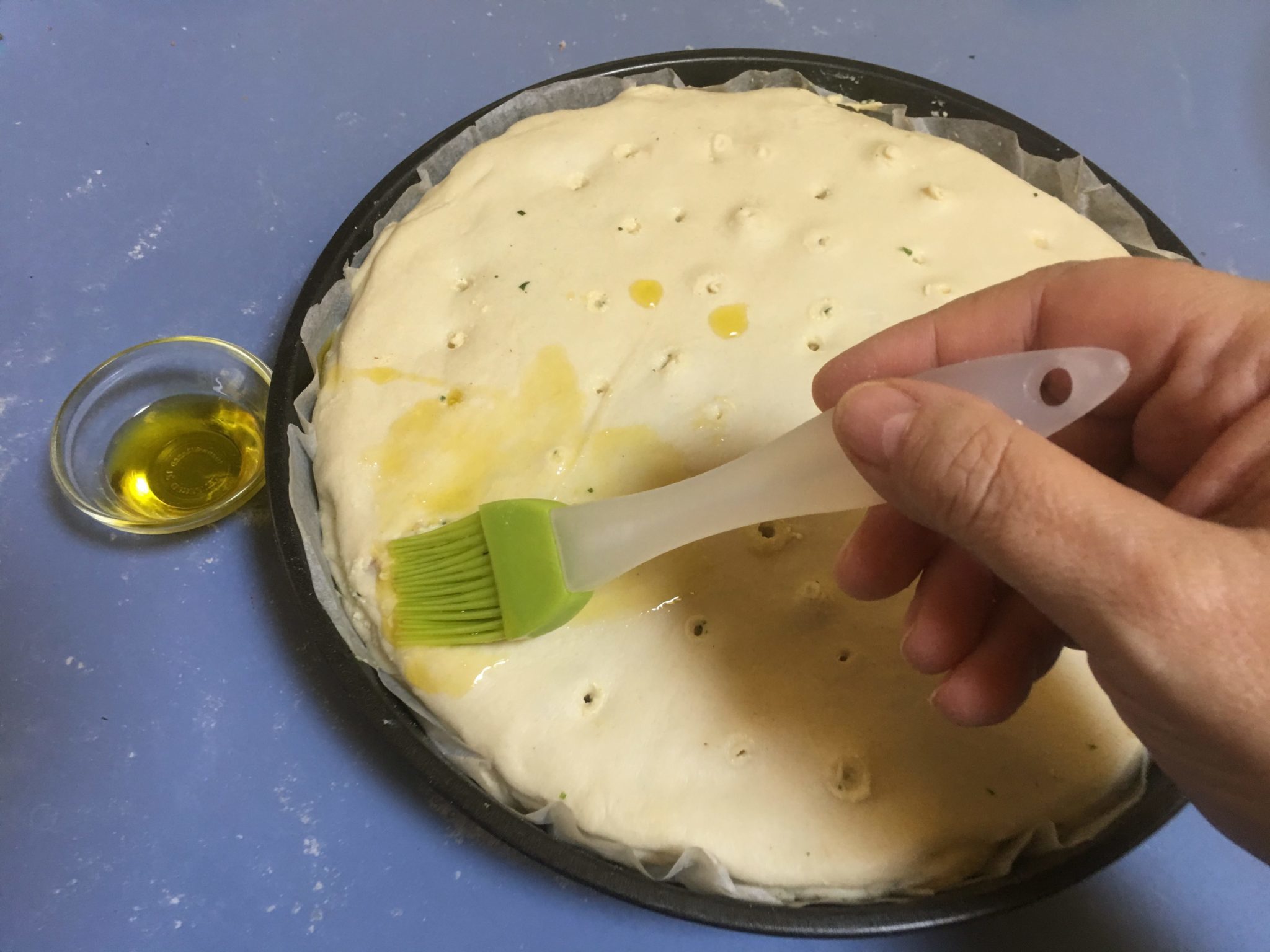 Bucherelliamo tutta la superficie della pizza e la pennelliamo con un po d’olio extravergine.